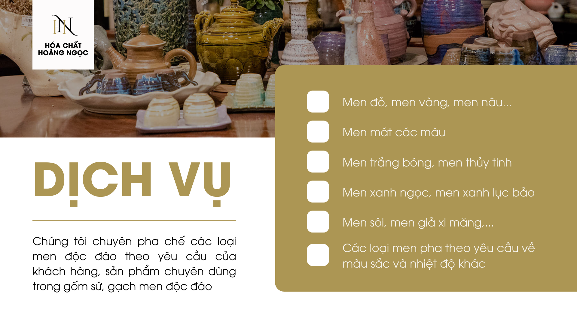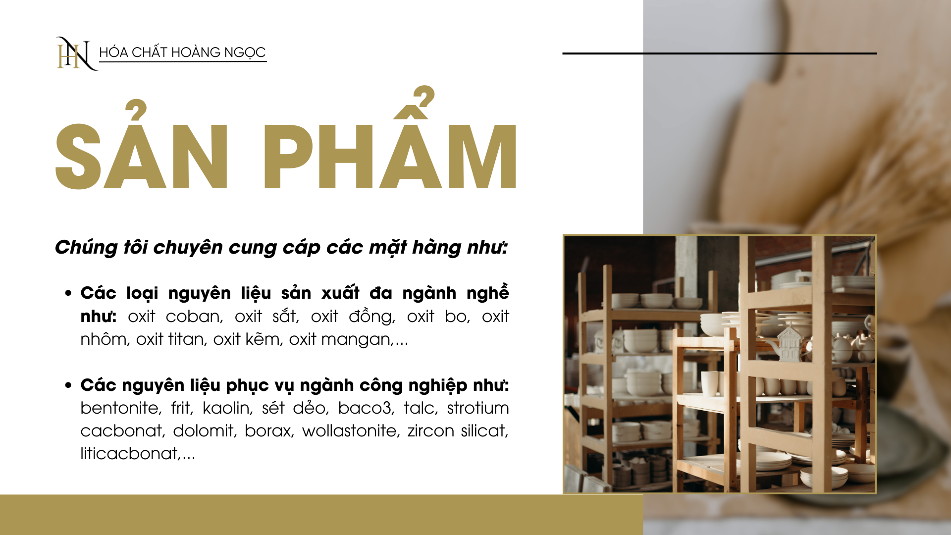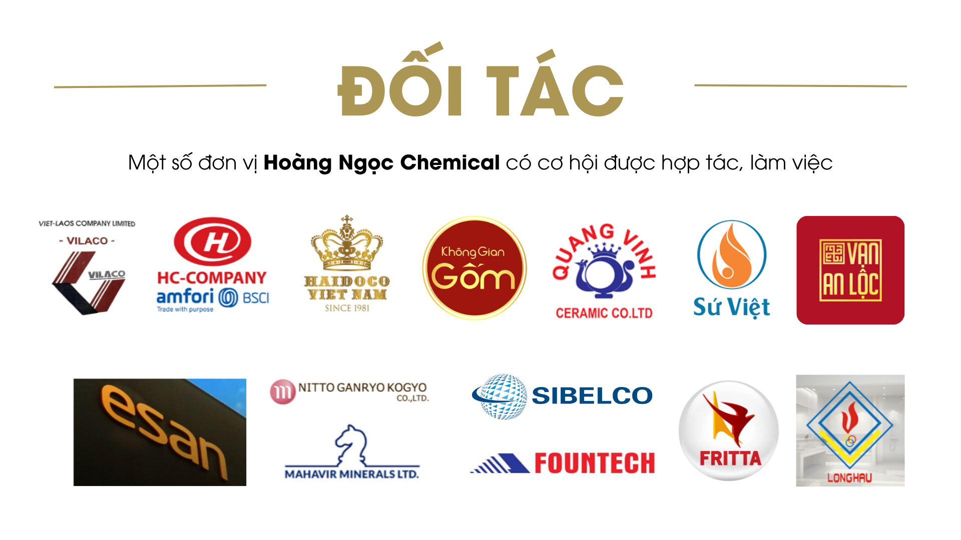 “CHÀO MỪNG QUÝ KHÁCH HÀNG, CHÚC MỘT NGÀY VUI VÀ LÀM VIỆC HIỆU QUẢ! HÓA CHẤT HOÀNG NGỌC RẤT MONG MUỐN ĐƯỢC HỢP TÁC VỚI QUÝ KHÁCH” “ Hóa chất Hoàng Ngọc là nhà phân phối hóa chất ngành sản xuất gốm sứ, thủy tinh, ngành sơn, … và hóa chất đa ngành nghề khác. Chúng tôi đang tìm kiếm các đối tác trong và ngoài nước để cùng hợp tác và phát triển các nguyên vật liệu, hóa chất mới cho ngành sản xuất gốm sứ, ngành công nghiệp thủy tinh, ngành sơn và các ngành nghề có liên quan, … “HÓA CHẤT HOÀNG NGỌC KÍNH CHÀO VÀ MONG NHẬN ĐƯỢC ĐƠN HÀNG TỪ QUÝ KHÁCH!