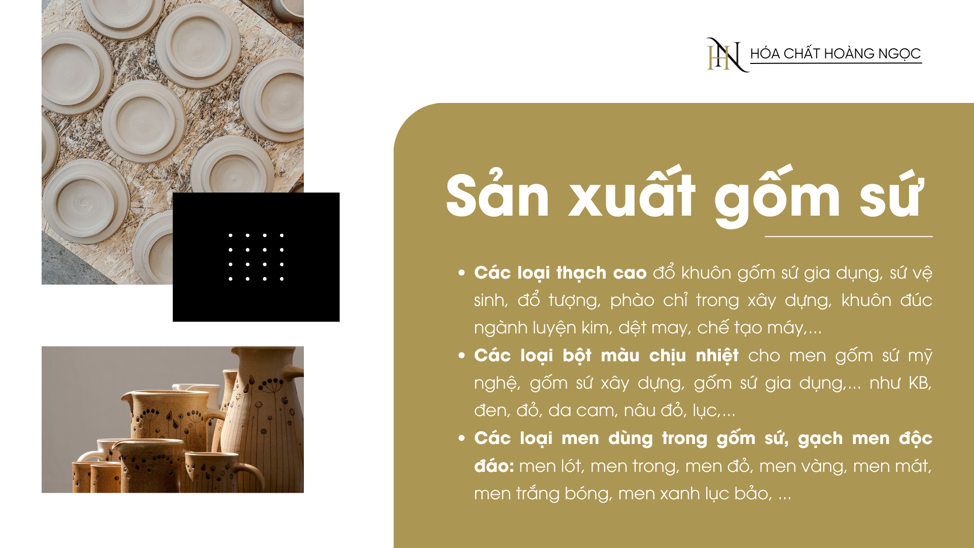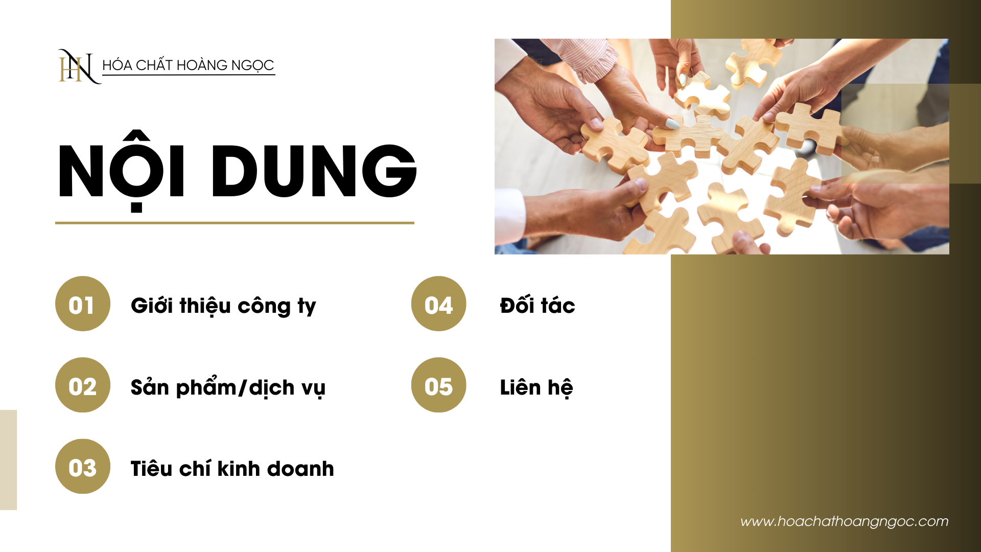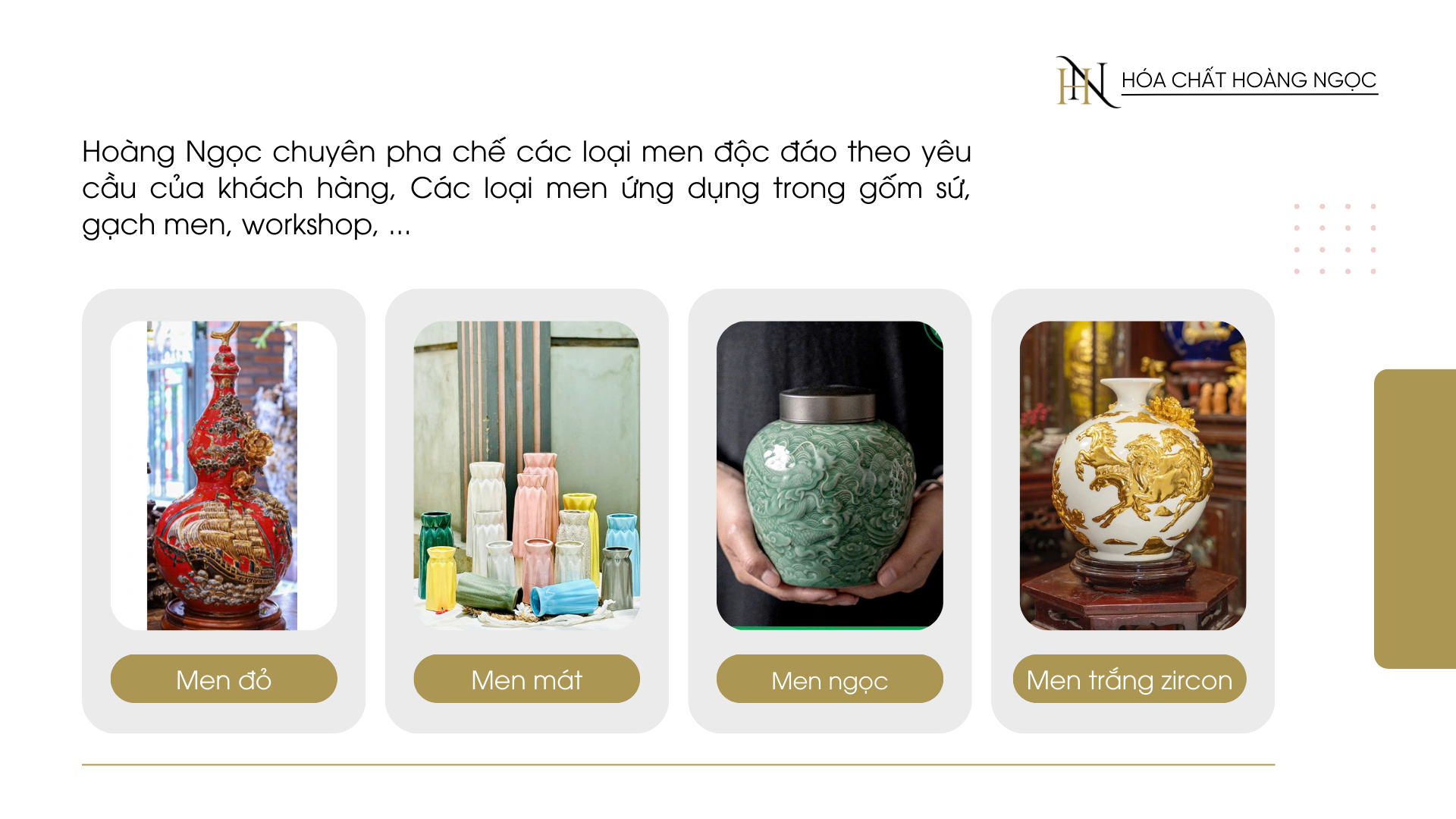 “CHÀO MỪNG QUÝ KHÁCH HÀNG, CHÚC MỘT NGÀY VUI VÀ LÀM VIỆC HIỆU QUẢ! HÓA CHẤT HOÀNG NGỌC RẤT MONG MUỐN ĐƯỢC HỢP TÁC VỚI QUÝ KHÁCH” “ Hóa chất Hoàng Ngọc là nhà phân phối hóa chất ngành sản xuất gốm sứ, thủy tinh, ngành sơn, … và hóa chất đa ngành nghề khác. Chúng tôi đang tìm kiếm các đối tác trong và ngoài nước để cùng hợp tác và phát triển các nguyên vật liệu, hóa chất mới cho ngành sản xuất gốm sứ, ngành công nghiệp thủy tinh, ngành sơn và các ngành nghề có liên quan, … “HÓA CHẤT HOÀNG NGỌC KÍNH CHÀO VÀ MONG NHẬN ĐƯỢC ĐƠN HÀNG TỪ QUÝ KHÁCH!