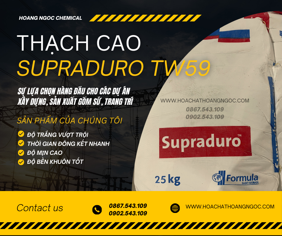 Hóa chất Hoàng Ngọc là một trong những đơn vị đi đầu trong sản xuất và phân phối các loại hóa chất công nghiệp. Tại Hóa chất Hoàng Ngọc, thạch cao Thái Lan Supraduro TW59 được nhập khẩu trực tiếp, có giấy tờ nguồn gốc rõ ràng, dịch vụ hỗ trợ khách hàng tối ưu nhất.